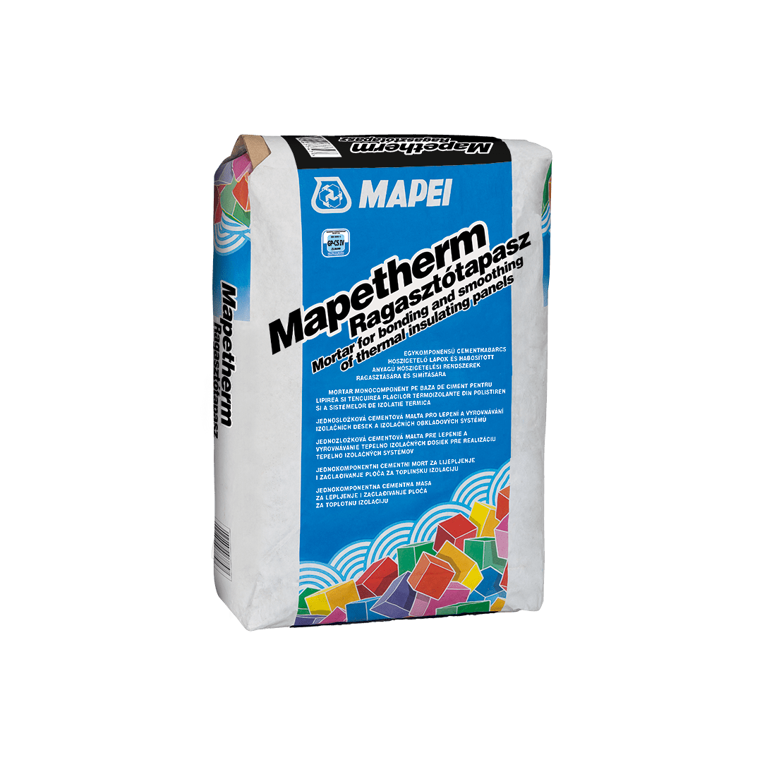 A Mapetherm Ragasztótapasz habosított polisztirol, extrudált poliészter, habosított poliuretán, kőzetgyapot, parafa, stb. hőszigetelő táblák ragasztására és simítására használható, közvetlenül a vakolt, betonrészekből vagy beton falazóblokkokból készült falak illetve mennyezetek kül- vagy beltéri felületeire történő ragasztáskor.