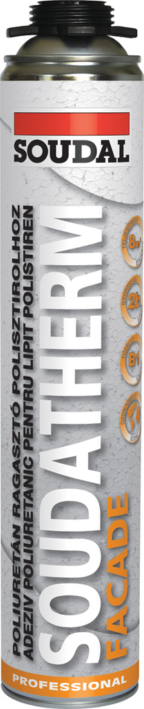 A Soudatherm Facade egy használatra kész, egykomponensű, önexpanzionáló, poliuretán ragasztóhab. Homlokzat, hőszigetelő anyagok, polisztirol hablemezek, egyéb építő- és burkolóanyagok ragasztásához.