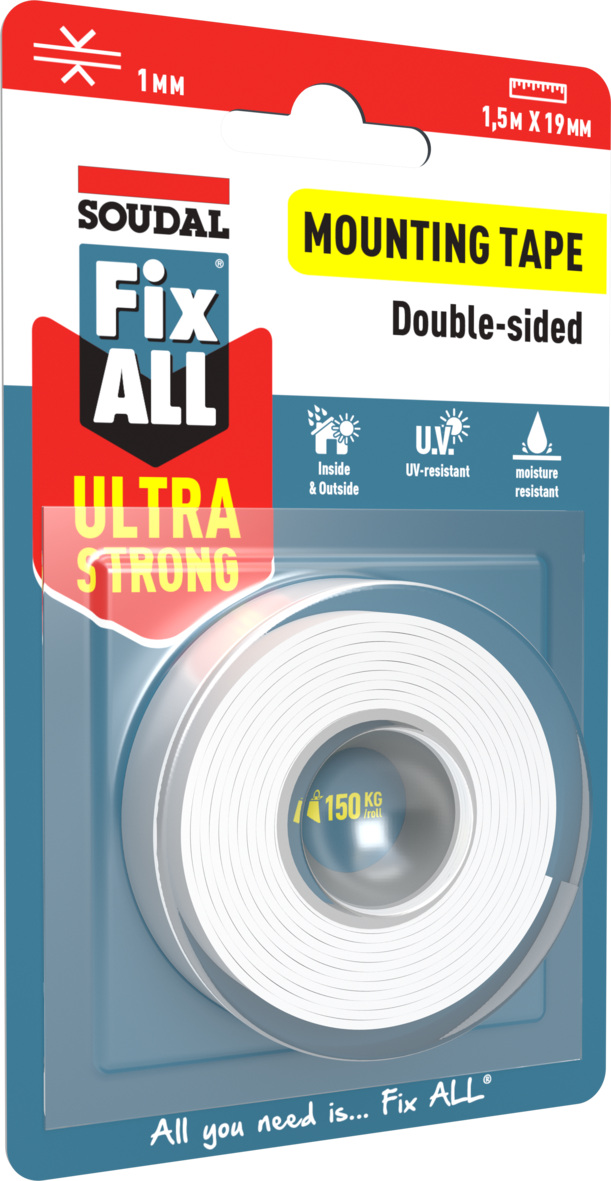 Ultraerős kétoldalú ragasztószalag. Ideális különféle anyagok gyors, könnyű és tartós ragasztására és felszerelésére. Például tükör, üveg, csempe, kő, acél, a legtöbb fajta fém, furnér, bevonatos fa és a legtöbb műanyag esetén. A Fix ALL Ultraerős Ragasztószalag hosszútávú és tartós ragasztást biztosít a felületeken és kültéren és beltéren is használható.