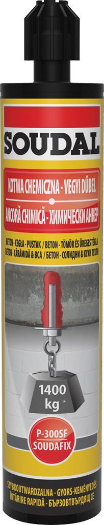 SOUDAFIX P300-SF kétkomponensű vegyidűbel poliészter bázissal. Nem indukál feszültséget a szerkezetben. Alkalmas csavarok, menetes szárak, betonvas ragasztására különböző repedésmentes beton, könnyűbeton, tömör tégla, lyukacsos tégla, pórusbeton, természeter kő, gipszkarton falazatok, stb. esetén.