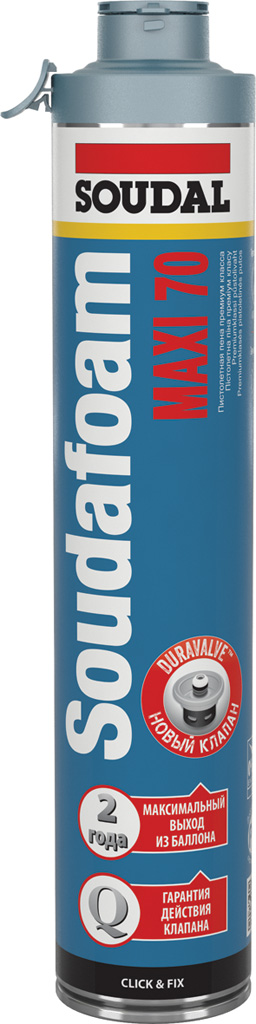 A Soudafoam MAXI egy egykomponensű, használatra kész poliuretán hab amelyet rendkívül magas kiadósság mellett kiemelkedő költséghatékonyság jellemez. Szabadalmaztatott Click&Fix rendszerrel. A hab kiválóan tapad szinte valamennyi építési felülethez (kivéve Teflon, PE és PP), rövid kötési idő, magas hő- és hangszigetelő érték jellemzi. Kiváló szerkezetű és rendkívül jó stabilitású. CFC mentes és HCFC mentes hajtógázt tartalmaz, így nem ártalmas az ózonrétegre.A Duravalve szelepnek köszönhetően optimális kiadósságú marad a teljes szavatosság alatt, még akkor is amikor fektetve szállítják.