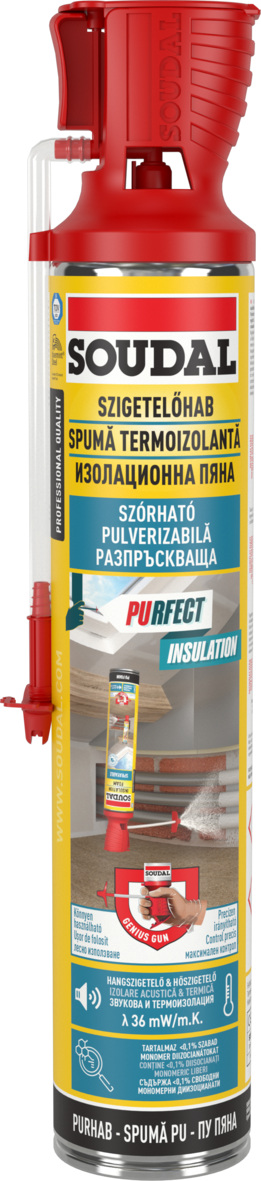 - A termék használata előtt takarjon le minden szomszédos területet a szennyeződések elkerülése érdekében. Beltéri használat esetén gondoskodni kell a jó szellőzésről. Az aeroszolos flakont legalább 20 másodpercig rázza fel. Nyissa ki a kupakot és egyenesítse meg a csövet. A Soudamax adapter hegyére már fel van erősítve a felhordó fúvóka. A felületnek zsír- és pormentesnek kell lennie. Alkalmazás előtt nedvesítse meg a felületeket vízpermettel. Nem szokványos felületek esetén előzetes tapadási teszt elvégzése ajánlott. Szükség szerint forgassa el a fúvókát (függőleges vagy vízszintes felhordáshoz). Az optimális habkibocsátás érdekében nyomja meg teljesen a Genius adapter kioldóját. Hordja fel a habot kb. 30-40 cm távolságból a felületre. Az alkalmazás távolsága határozza meg a szóráskép szélességét. A hab kétszer olyan vastagságúra tágul, mint amilyen vastagságban kiszóródik. Ne vigyen fel egyszerre három, kb. 1 cm-es rétegnél többet, illetve ne lépje túl a 2,5 cm-es vastagságot egyszerre. Ha több rétegre van szükség, várjon kb. 30 percet a következő réteg felhordásával. Permetezze vízzel a felületet az egyes rétegek között. Tároláshoz: Vegye ki a szórófejet a Soudamax adapterből és tisztítsa meg, vegye le a dugót és csavarja a Soudamax adapter hegyére. Újboli használat elött rázza fel a flakont. A friss hab eltávolítható a Soudal Gun & Foamcleaner vagy aceton segítségével. A Gun & Foamcleaner használata előtt tesztelje, hogy a felületek károsodnak-e vagy sem. Különösen a műanyagok és a lakk- vagy festékrétegek lehetnek érzékenyek erre. A kikeményedett habot csak mechanikusan vagy a Soudal PU eltávolítóval lehet eltávolítani.