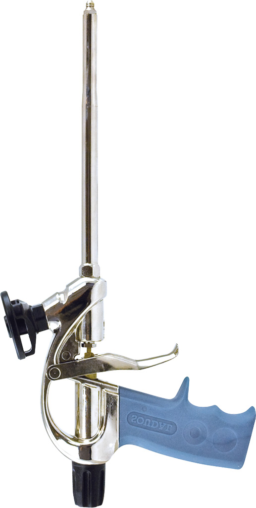 - A purhab flakont szorosan rögzítse a pisztolyra. Állítsa be a szabályozócsavart és a ravaszt meghúzva adagolja a habot. Ha a szórópisztolyt átmenetileg nem használja, zárja el a szabályozócsavart és tisztítsa meg a pisztoly csúcsát a Soudal Gun Cleaner segítségével. Ha befejezte a pisztoly használatát, alaposan tisztítsa meg a pisztolyt Soudal Gun Cleaner-el.