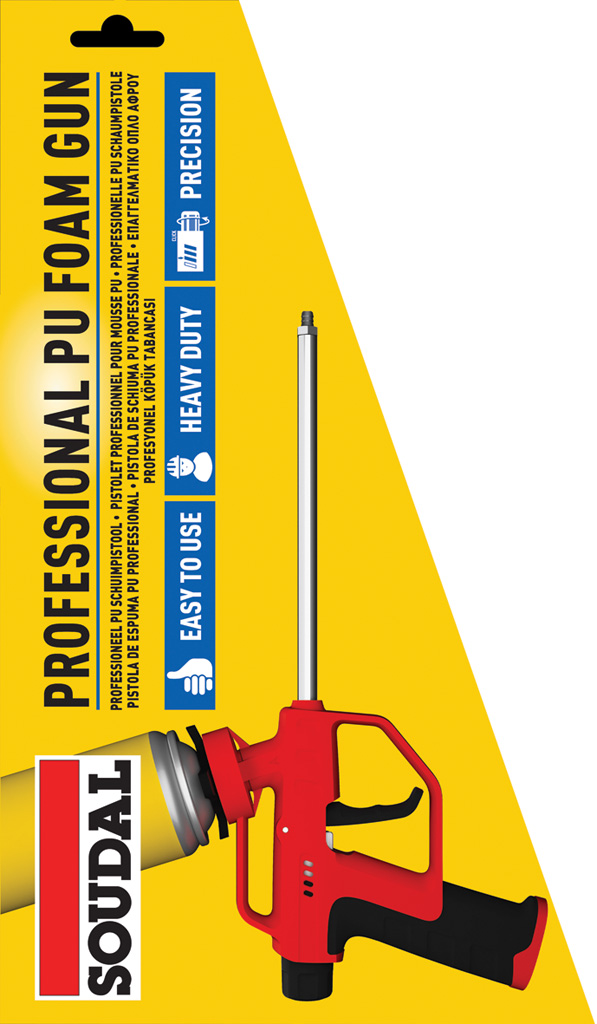 - Illessze szorosan a habos flakont a pisztolyra. Állítsa be az állítócsavart, és húzza meg a ravaszt a hab kifújásához. Ha ideiglenesen nem használja a pisztolyt, zárja le az állítócsavart, és tisztítsa meg a pisztoly csőrét Soudal Gun Cleanerrel. Használat után alaposan tisztítsa meg a pisztolyt Soudal Gun Cleanerrel.